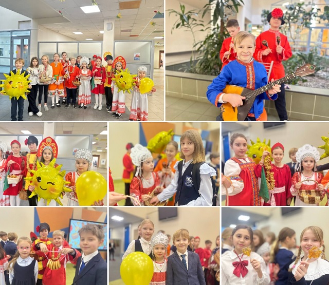 Сегодня утром учеников встречали скоморохи и ряженые, а в руках у всех были вкусные баранки, сушки и конфеты. Ребята встречали весну играми, песнями и танцами.
